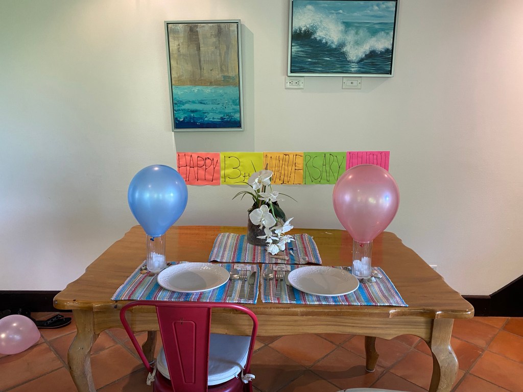 Lest there be any confusion, we do not eat like this every night. The day before we had mac and cheese and broccoli for dinner and the night before that is was rice and beans and fried plantains. We’d heard about this beachside restaurant called Coco Loco when we first arrived, but quickly realized we needed to do more dining in than out. So we’ve been saving this one for our anniversary.