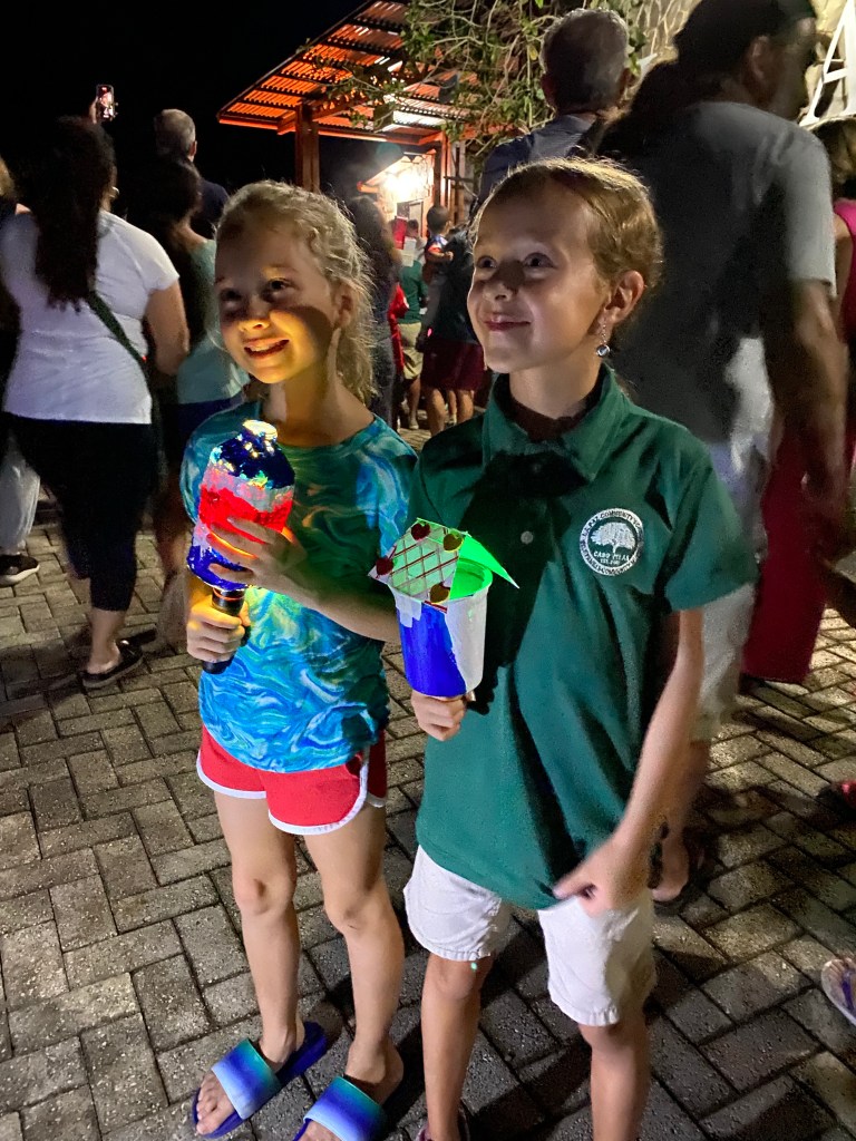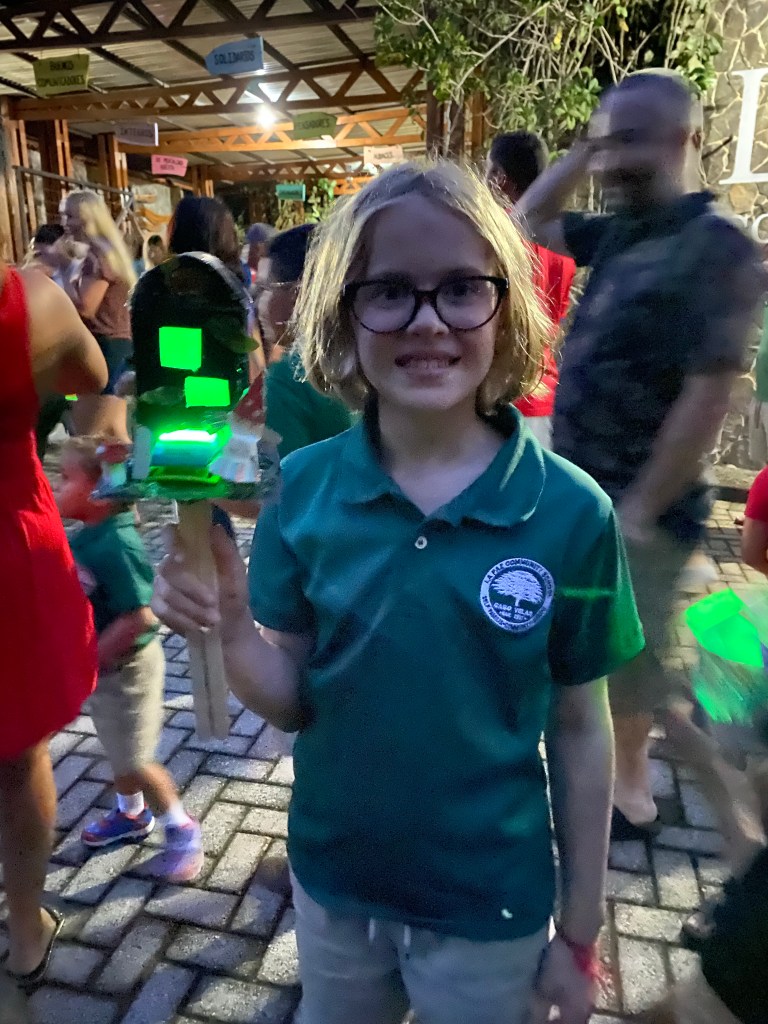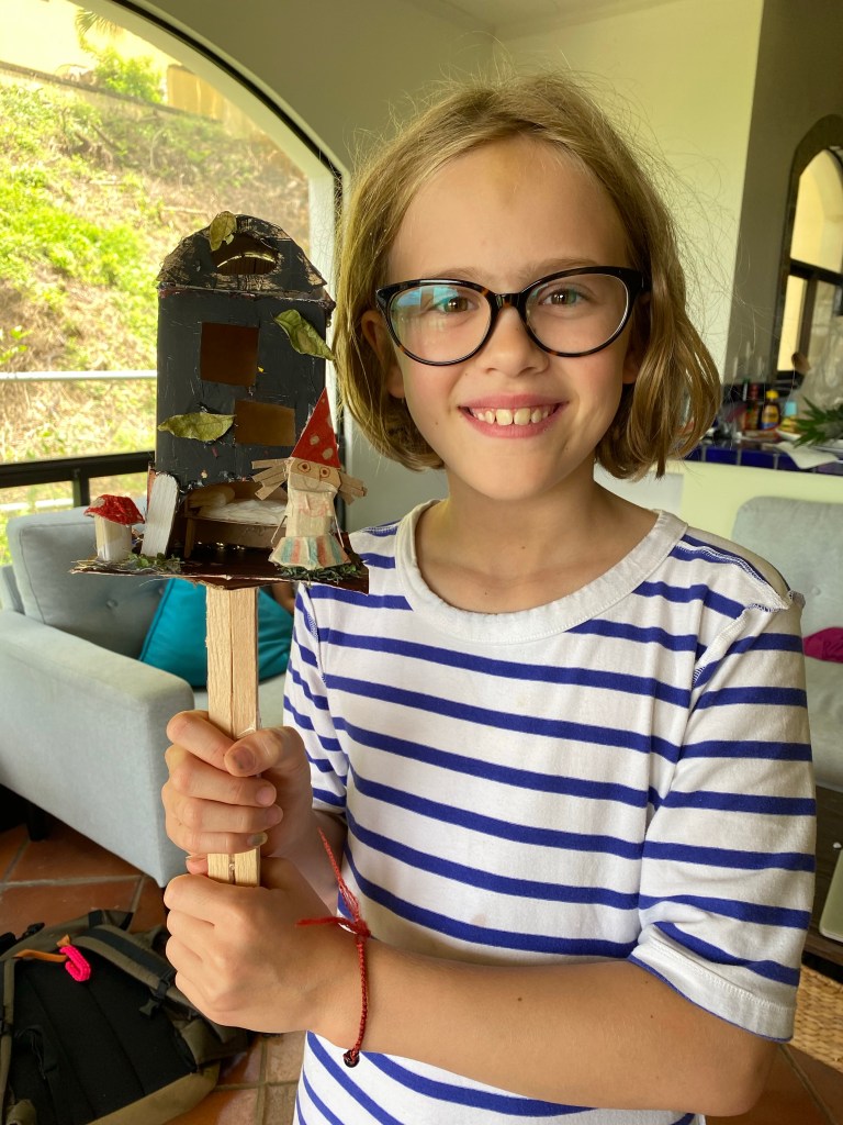 Lydia is very proud of her gnome house lantern. The gnome’s skirt features the colors of the Costa Rican flag and her shirt says ‘Costa Rica.’