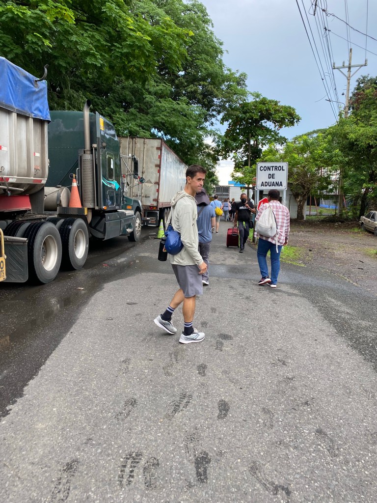 There were already a lot of trucks waiting in line to cross the border when we arrived. Because it is easier not to cross in a Costa Rican vehicle, and because we were with a group, we all walked across the border.