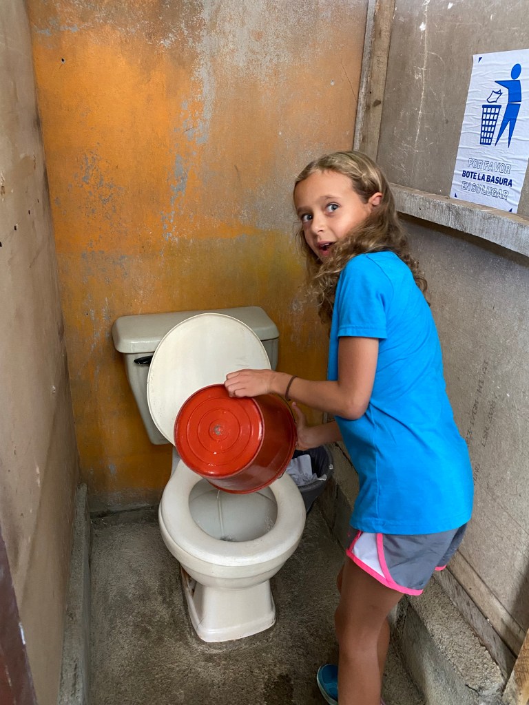 Bathroom break. Tess picked up the local method of flushing right away.