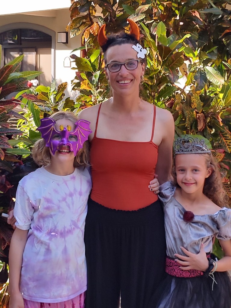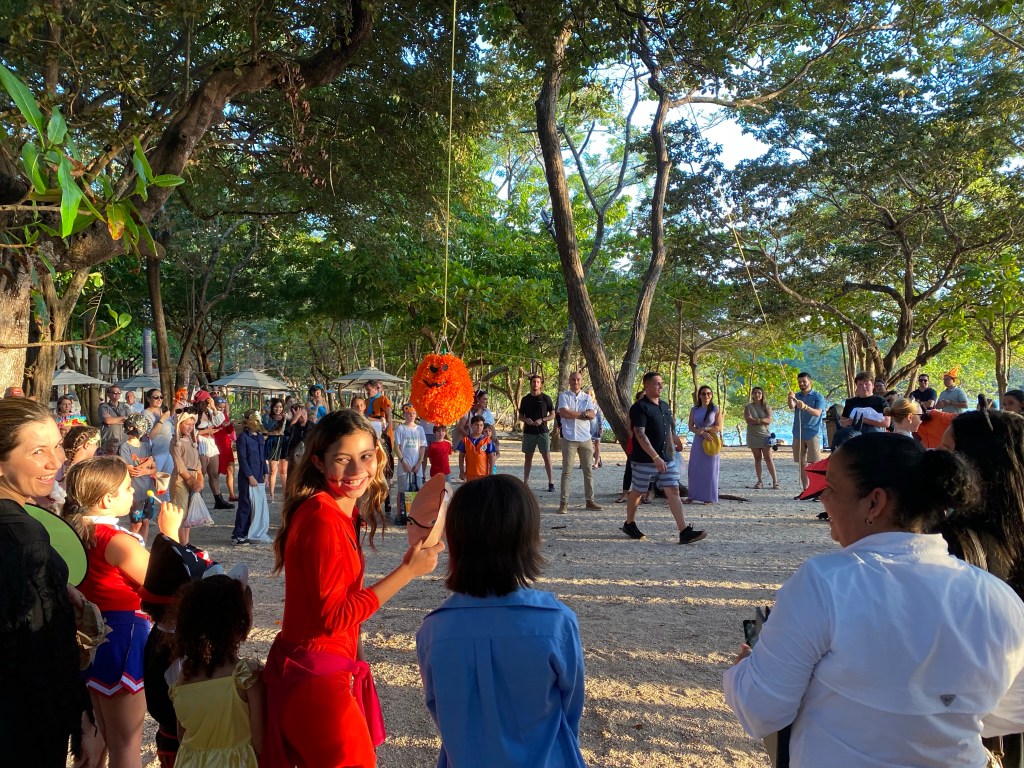The girls and I get ready to party in Las Catalinas (a small, compact, car-free town inspired by Mediterranean hill towns). The town literally lies at the end of the road and is about 15 minutes from where we live. This was the first time since Covid hit that the Día de la Mascarada/Halloween party was back in action.