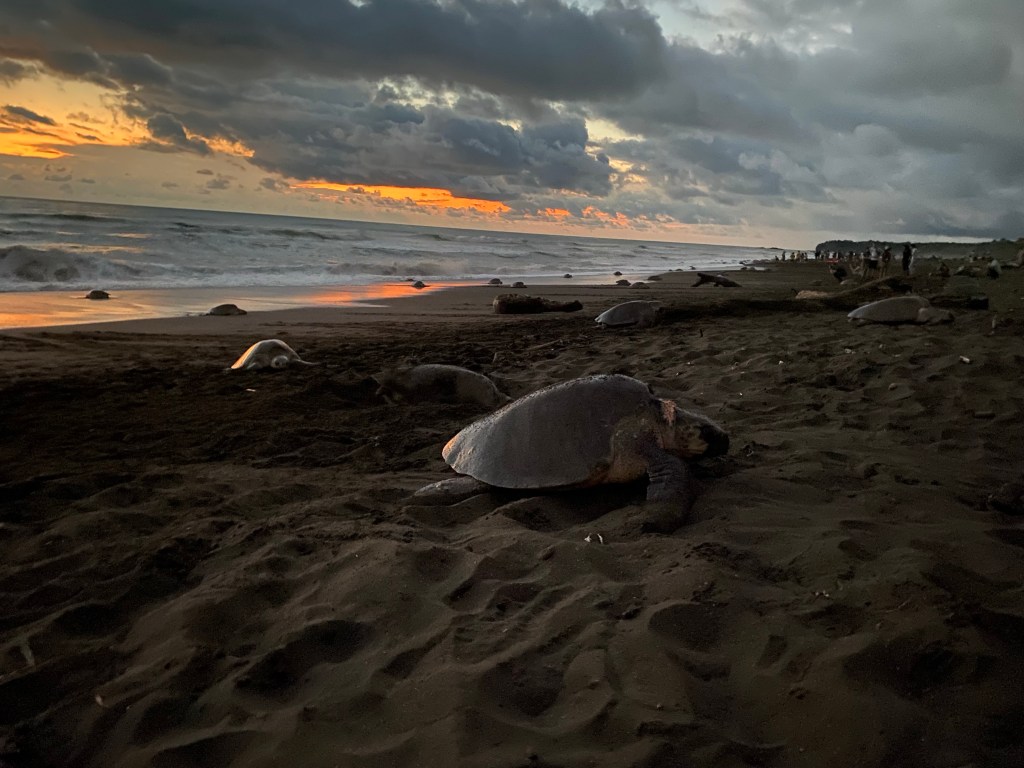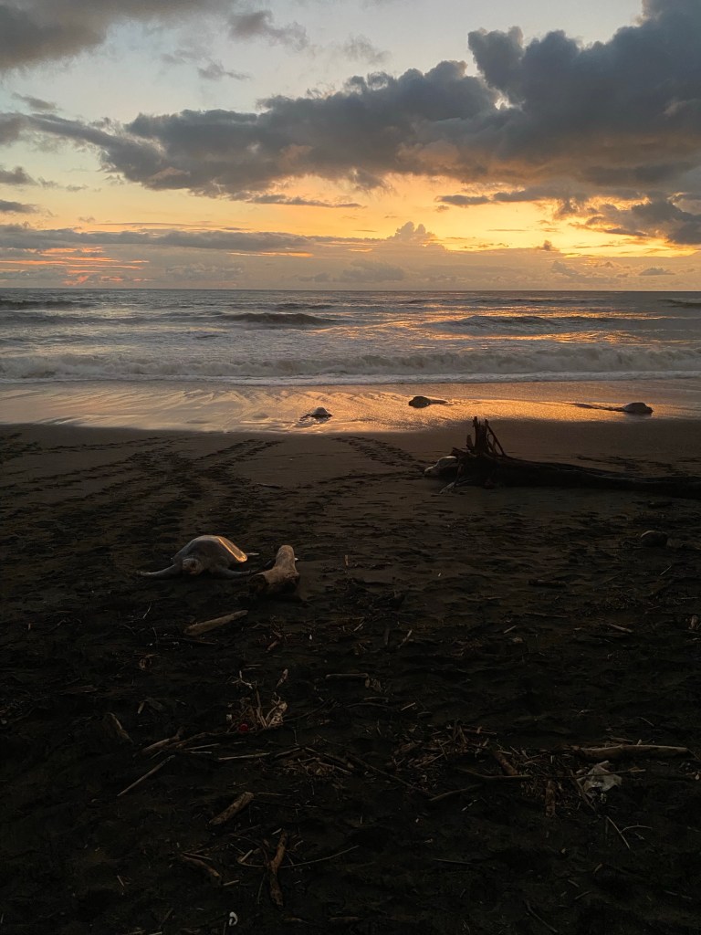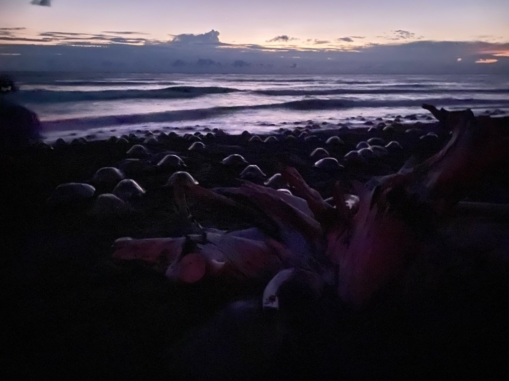During an arribada or ‘arrival’, you need to go with a local guide onto the beach. The turtles arriving on Playa Ostional are Olive Ridley’s turtles (different from the larger leatherbacks that also lay eggs on other beaches in Costa Rica). Our first glimps of them was at 5:30pm on our first day. At sunset there were already quite a few around, and by the time we left in darkness it was hard to find footing. They are not shy though. I got bowled into at least twice. Those mamas are quick and powerful and won’t hesitate to knock right into your ankles if you are in their way.