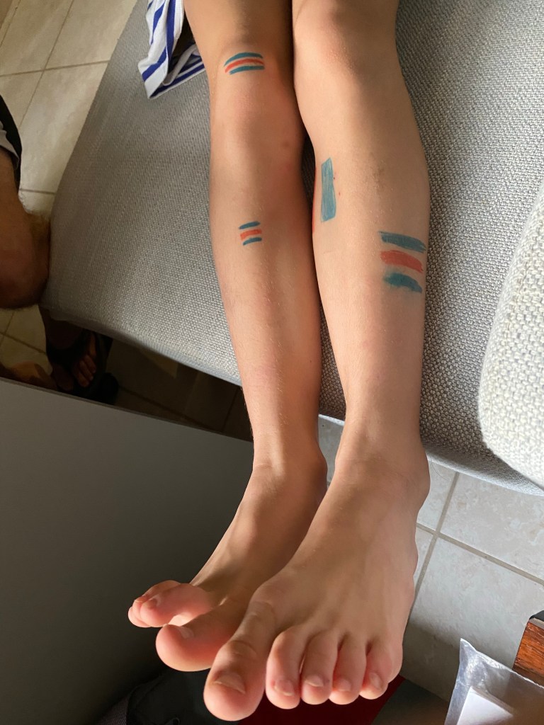 Update: The girls had fun watching at school and came home adorned with some additional fan art. The bad news is the final score was Spain: 7, Costa Rica: 0.