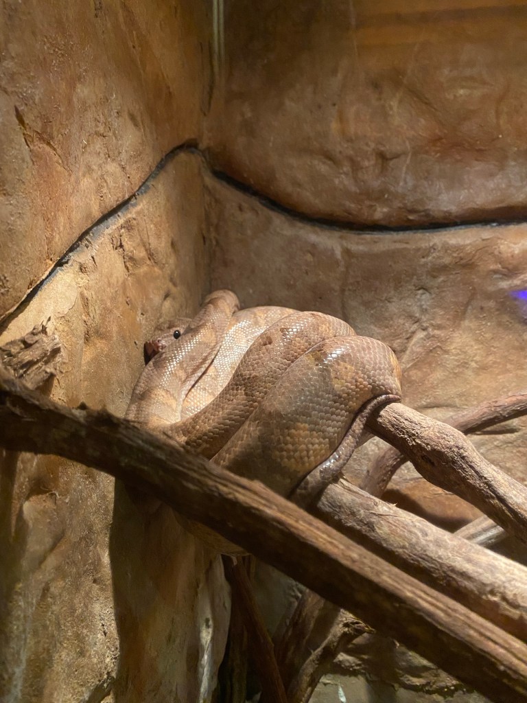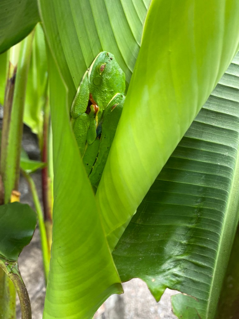 The frog exhibit here was very cool because the frogs were free range, just hanging out on the leaves of big plants in pots. The is the famous red-eyed tree frog. During the day they look a little different because their eyes are closed and they are resting. The glamor shots happen at night. This picture is interesting because it shows a male and female in amplexus or the mating position.