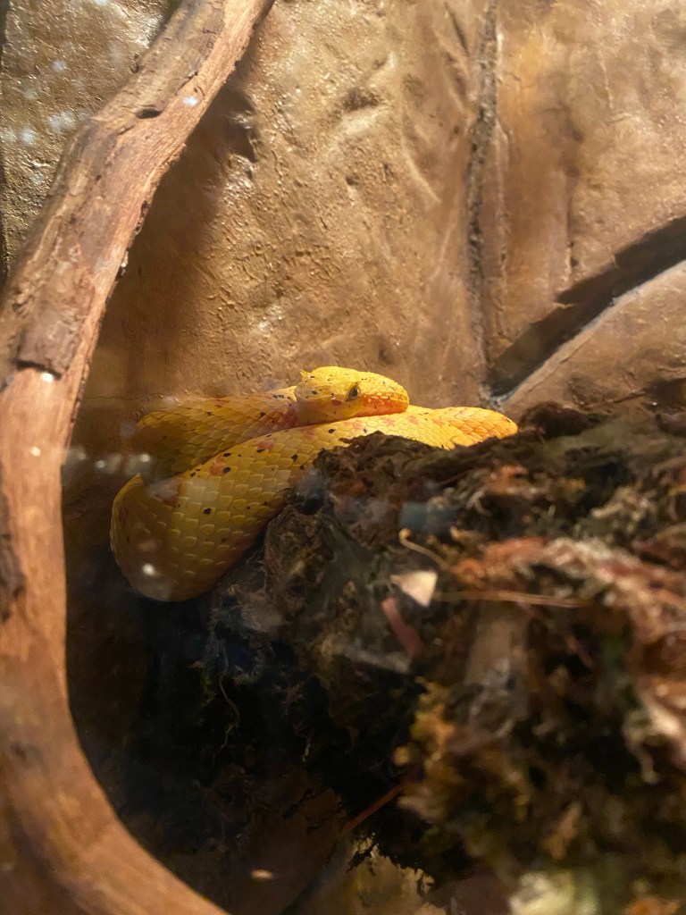 The yellow eyelash viper. We saw its cousin the brown eyelash viper in the wild on our hike in Tenorio National Park.